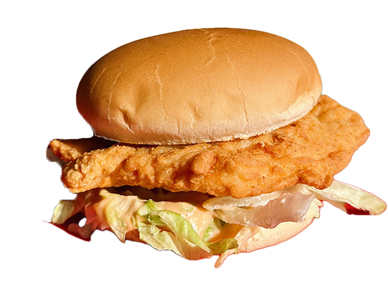 A whole chicken breast hand breaded tenderized and deep fried to golden crispy perfection. Garnished with Creamy and Tangy Bronco's Sauce Lettuce and Tomato.